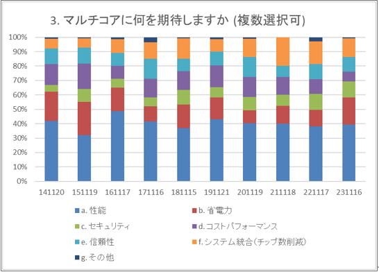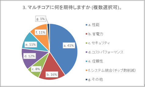 まず、マルチコアに期待する点です。下の円グラフは10年間の総計であり、多い方から性能への期待が41%、省電力への期待が16%です。またシステム統合(チップ数削減)への期待も11%程度あります。